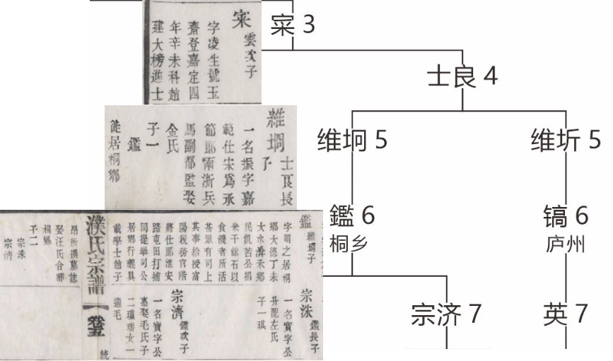 濮氏宗谱的三世祖之一濮寀(字凌生),南宋宋宁宗赵扩(1194年7月24日-1224年9月17日在位)嘉定四年辛未(1211年)赵建大榜进士。其孙濮振(维坰,字嘉范),举乡进士,为承节郎,官两浙东路兵马司副都监、婺州住剳。其子濮鑑(字明之),居桐乡,(元)大德丁未(1307年),大水渰禾,乡民饥苦,公捐米千余石以食饥者,所活甚众,有司上其事者,给授富阳税务官階将仕郎,淮安路屯田打捕同提举司,公居乡行义,具载学士趙子昂(赵孟頫)所撰墓志,娶汪氏,合葬桐乡。