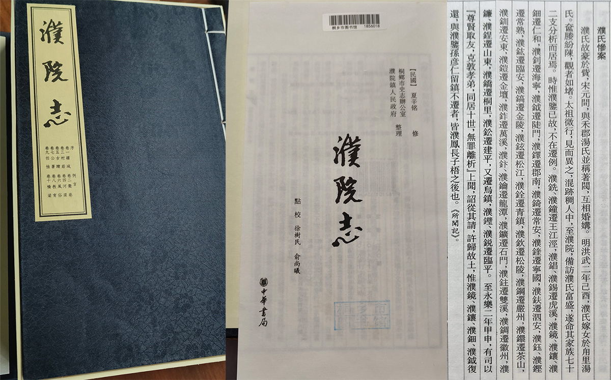 2024年3月6日,濮氏宗谱续修理事会会长晓明、下场头分会会长志法、洛社支建效和无锡明通动力工业有限公司员工贾鸥一行四人,轻装上阵,循着五年前晓明探访桐乡的路线,又一次踏上了桐乡寻亲之路。濮氏宗谱的六世祖濮鑑一脉,在桐乡濮院镇(古称槜李墟、幽湖、梅泾)书写下了嘉兴濮院历史上极其浓厚的一笔(此地因濮家的兴盛而的名)。